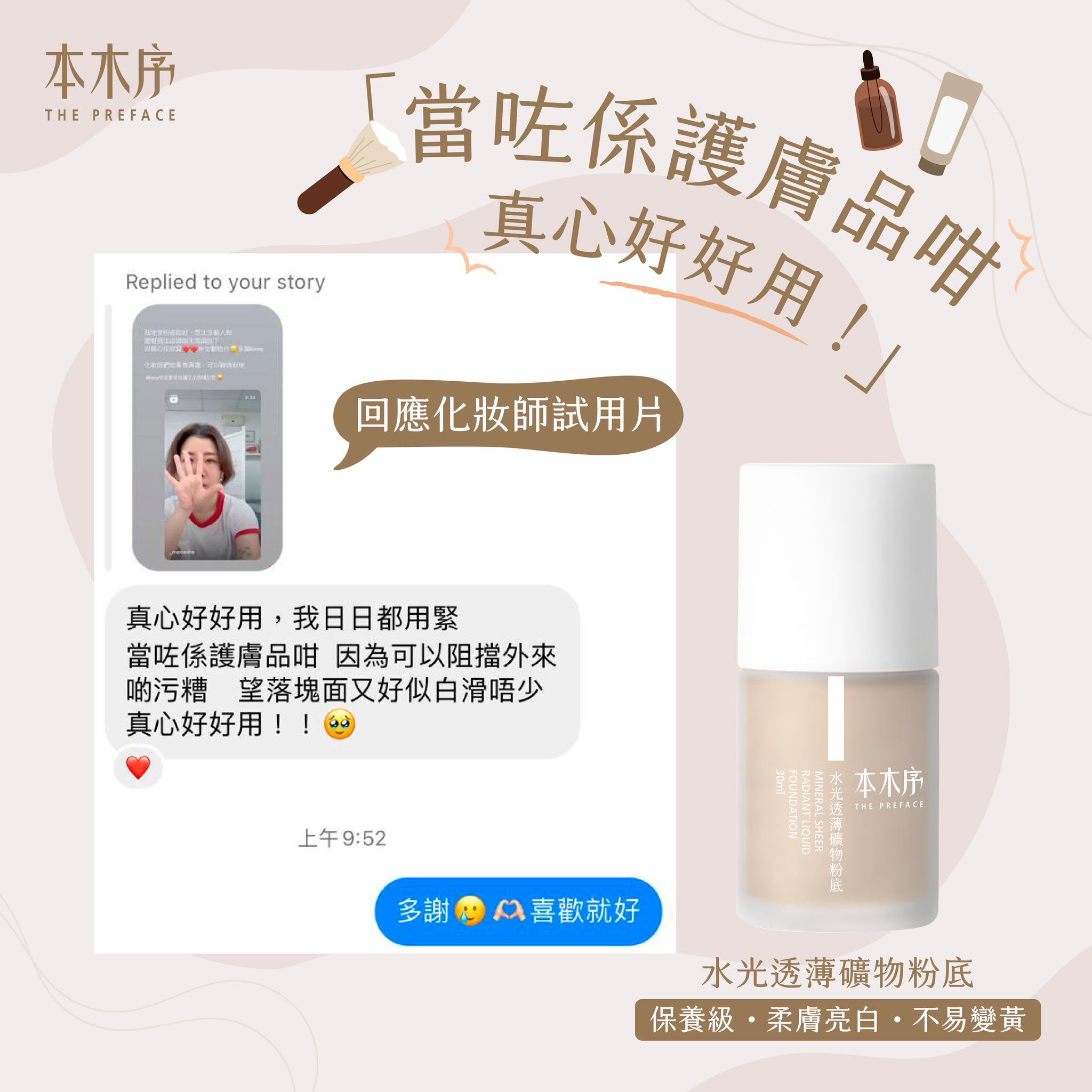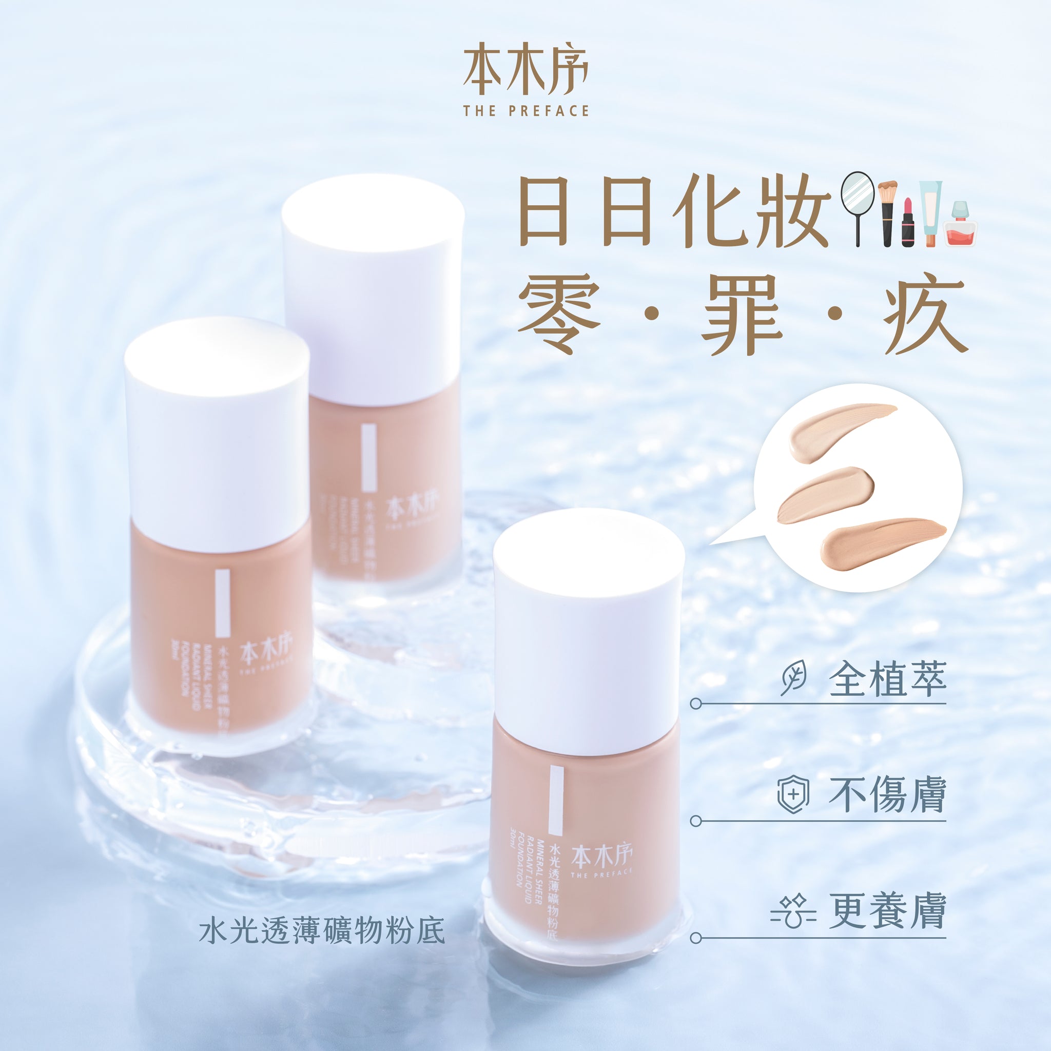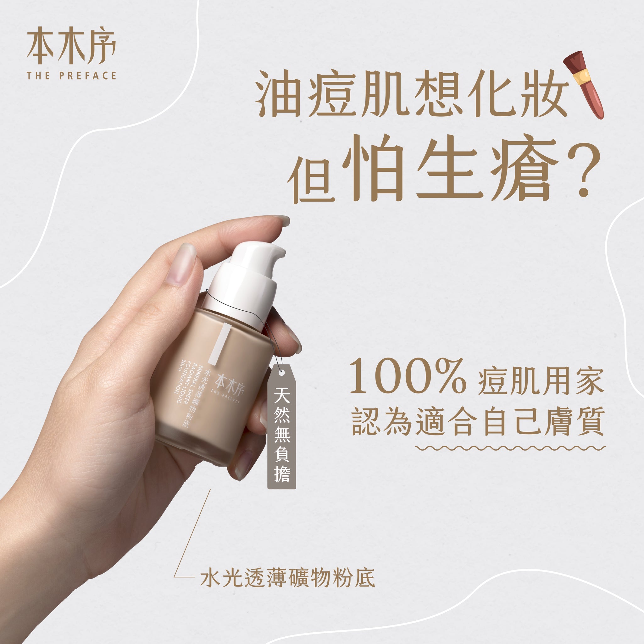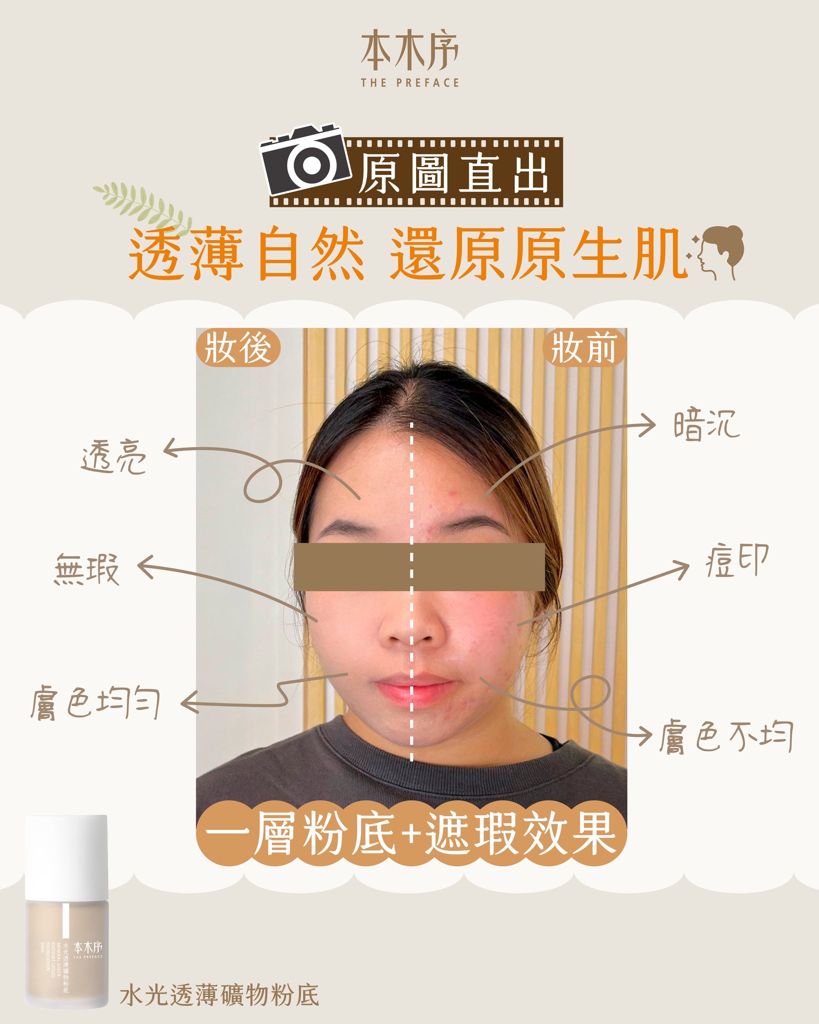以植萃為本的粉底液,有如著色護膚品。質地輕透不阻毛孔,有效均勻膚色、修飾瑕疵;同時兼具保濕、抗氧化及抗炎控痘功能,更具輕度防曬功效。不易氧化變色,維持全日清爽好氣息,打造自然裸妝感。