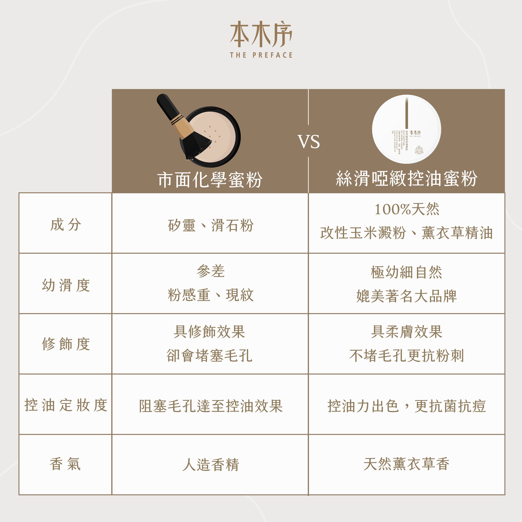 透明的純天然蜜粉改善油光;以改性玉米澱粉製成,質地極幼細、絲滑,吸收油分的同時不令皮膚乾燥;添加薰衣草精油,加強抗菌以減少暗瘡、暗粒形成。