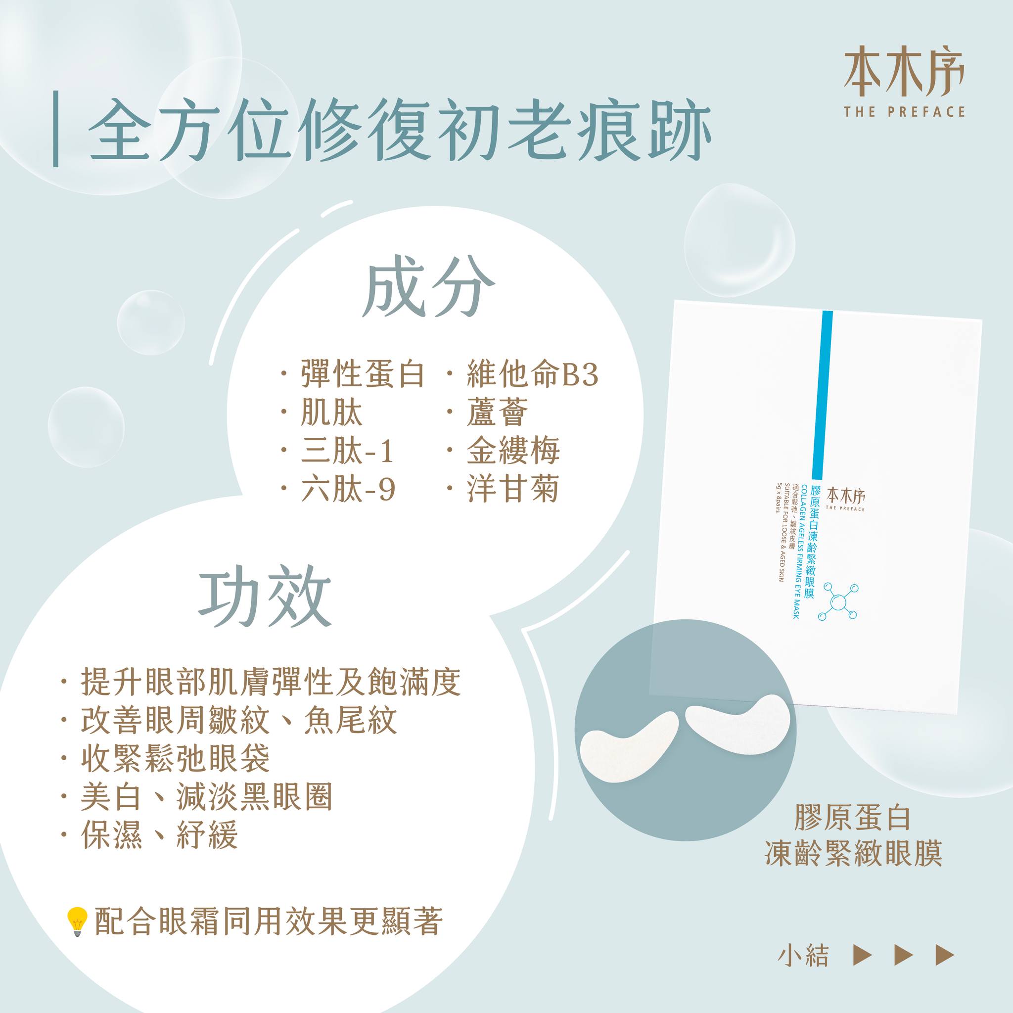膠原蛋白及彈性蛋白為眼周提拱雙重彈力呵護,協同多種肽,此眼膜有效增加皮膚彈性、去除眼紋、收緊鬆弛眼袋;維他命B3有效美白、減淡黑眼圈;蘆薈、金縷梅、洋甘菊等植萃有助保濕、紓緩。