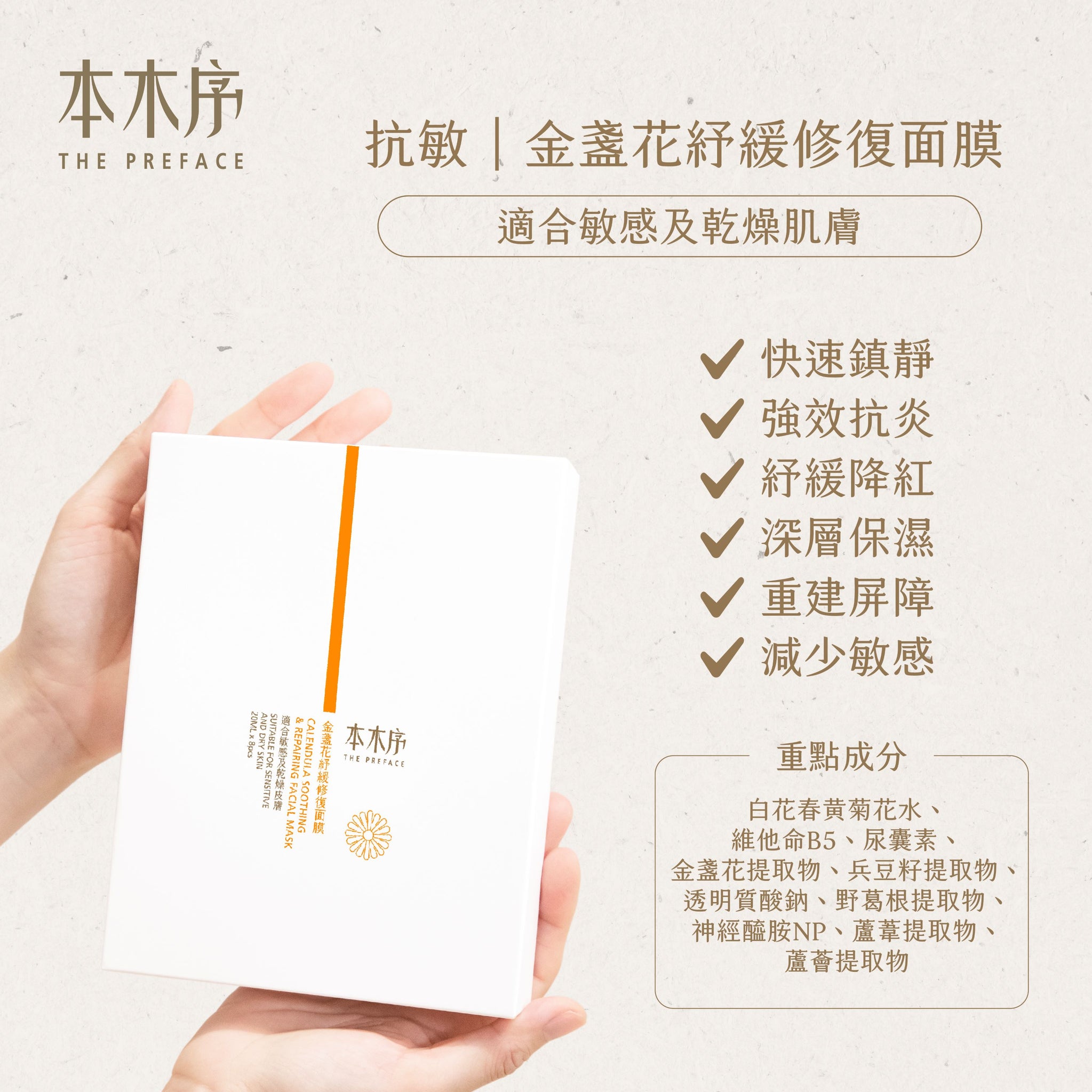 快速鎮靜,改善皮膚紅腫不適;深度補水,瞬間提升皮膚含水量;金盞花紓緩、降紅;分子釘重建皮膚屏障,減少敏感;兵豆籽、野葛根強效抑制炎症;每日15分鐘,連續使用2-3天即可明顯改善問題皮膚。